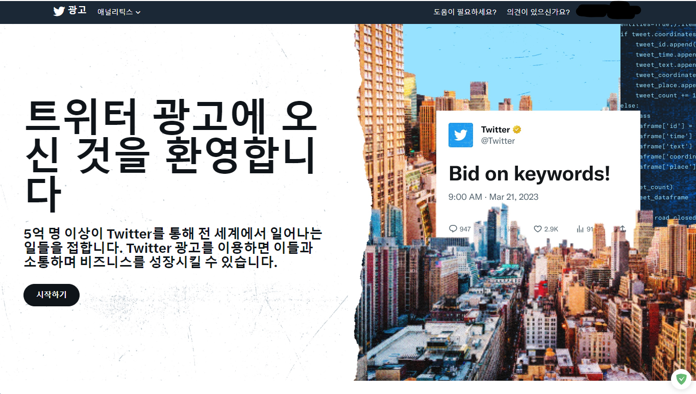 먼저, 트위터 광고 페이지에 접속한다. 링크는 다음과 같다.
